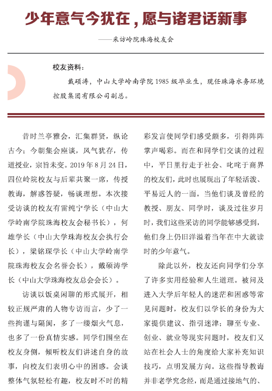 导航痕迹 中山大学岭南学院岭南校友 校友风采 校友寻访 戴硕涛:少年意气今犹在,愿与诸君话新事 扫描此二维码分享 戴硕涛:少年意气今犹在,愿与诸君话新事 发布人:校友办公室 发布日期:2020-12-30