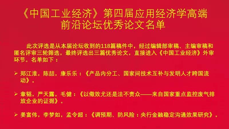 随后,李善民副校长宣布第七届《中国工业经济》优秀论文名单、《中国工业经济》第四届应用经济学高端前沿论坛优秀论文名单。本次论坛的优秀论文将直接进入《中国工业经济》外审环节。