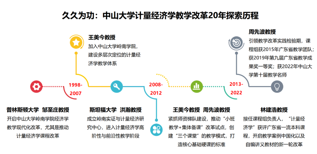 教学团队充分发挥教学名师的“领头羊”作用,重视梯队建设,形成不断探索教学规律的新局面。在享誉全球的计量经济学家邹至庄教授的指导下,岭南学院开启经济学教育现代化改革;王美今教授加入中山大学之后,主持建设了多层次定位的计量经济学教学体系;斯坦福大学洪瀚教授在岭南学院成立实证与计量经济研究中心,推动计量经济学教学迈向高阶性和前沿性;2012年起,王美今教授和周先波教授领衔推动本科计量经济学的“小班教学+集体备课”改革试点,历经十年打磨建立起基础硬课的标准化模式;林建浩教授接任课程组负责人后,开启了教学案例中国化以及自编讲义教材的新一轮改革。计量经济学的课程建设离不开所有授课老师和教务老师的辛勤付出与通力协作,李捷瑜、李兵、杨海生、郑昕、徐淑一、王霞等老师为课程建设做出了重要贡献。