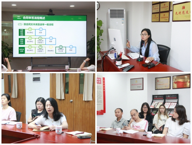 针对岭南学院在合同起草、合同流转等方面存在的问题,郭颖老师展开了详细的介绍,聚焦合同签订及管理流程、合同管理信息系统使用、合同归档等方面为学院有关行政教辅人员进行了业务培训,并对一些合同流转环节经常出现的问题进行解释说明。周晓驰老师在现场认真检查了学院近两年来所签订的各类合同,对所签订的合同中出现的不足之处一一进行指导。在培训过程中,学院各位与会的行政教职工结合自身在办理合同业务时遇到的问题积极发表提问,发展规划办公室法规与法律事务处各位领导老师均耐心给予解答,针对学院合同审批流程时间过长这一问题,双方展开积极讨论,并在现场制订了改进方案,培训会在热烈的讨论气氛中结束。