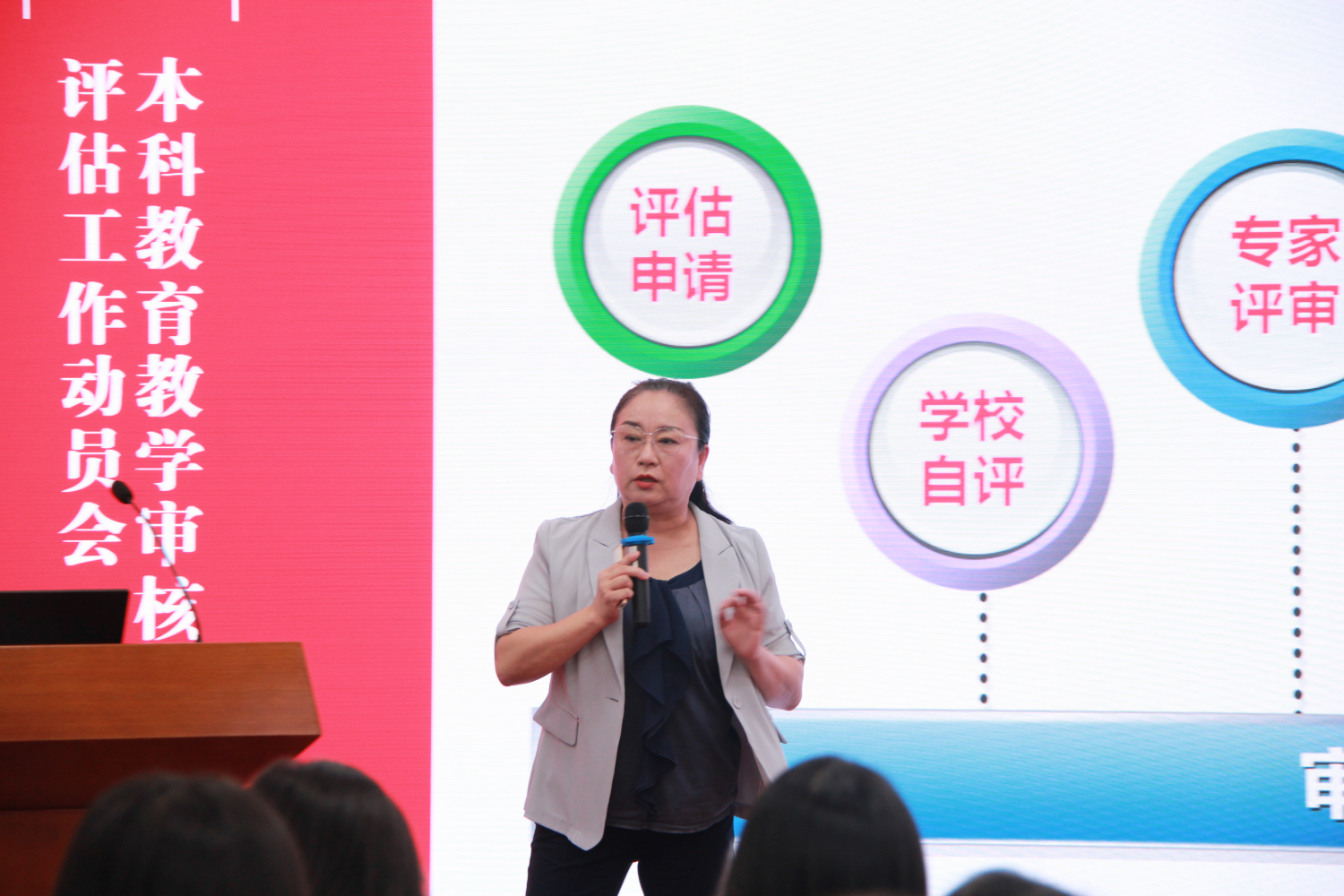 张雁处长围绕着学校参评新一轮审核评估、校内自评自建、专家组线上线下评估三个要点展开主题为《本科教育教学审核评估的院系工作要点》的报告。张雁处长介绍了学校过往参评审核评估的情况,明确新一轮审核评估的新变化、审核评估类型差异、以及审核评估工作流程。张雁处长提到新一轮审核评估新变化将从“教学评估”到“教育教学评估”,对学校整体围绕办学定位、本科人才培养目标和规格、本科教学工作进行全面全方位的考察,突出立德树人举措成效,考察学校“三全育人”整体格局,回应新时代新要求。另外,她强调评估的目的不是“证明”,而是“改进”,评估中心、高校和评估专家作为一个质量共同体,共同研究、推进我校人才培养质量保障体系建设。最后张雁处长对校内自评自建工作展开详细介绍,进一步分析新一轮审核评估相关要求及评估工作实施要点。