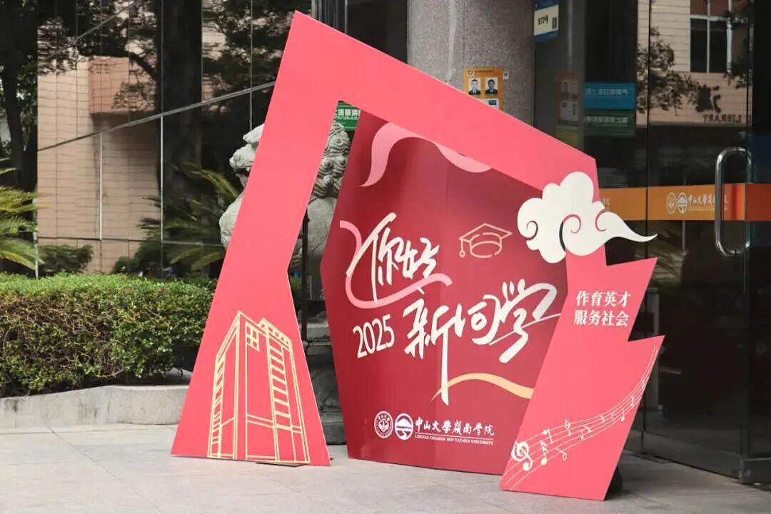 为确保报到工作高效有序,岭南学院提前完成迎新点的布置,在报到点和新生宿舍均摆放了迎新易拉宝,志愿者在新生宿舍门口贴好暖心标语。岭南堂内外,生动特色的欢迎展板吸引了众多新同学驻足打卡。学院合理安排身份核验、扫码报到、领取校卡、签名墙留影等环节,各流程专人负责,同学反馈良好。
