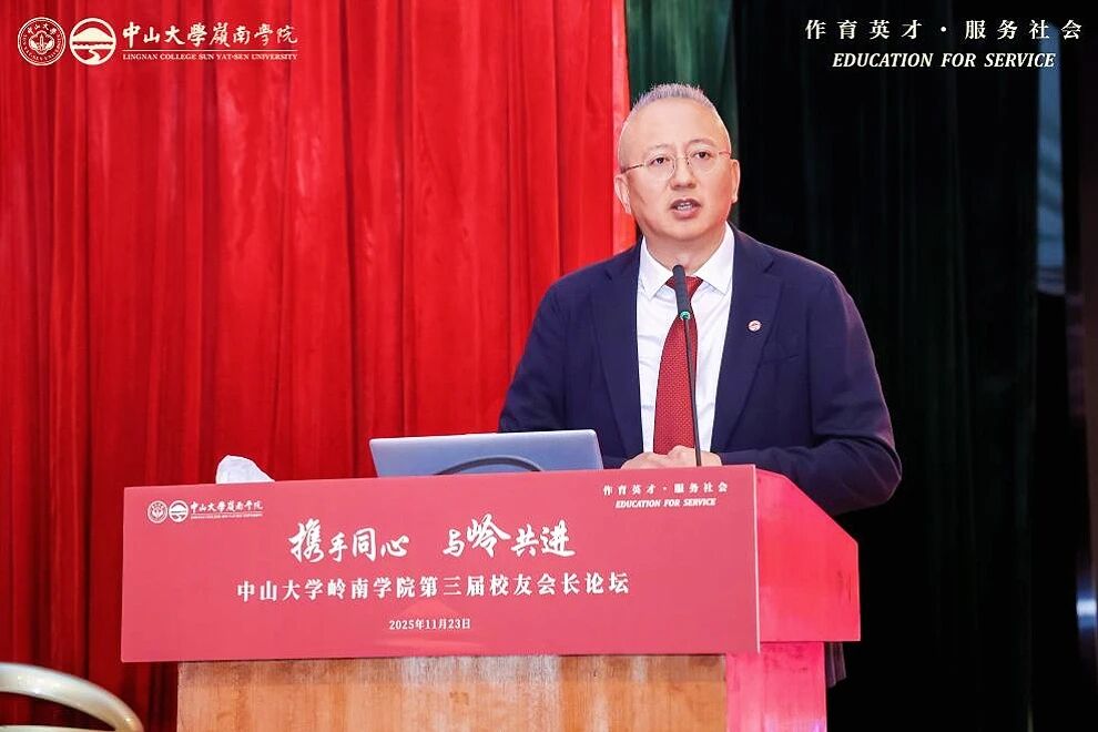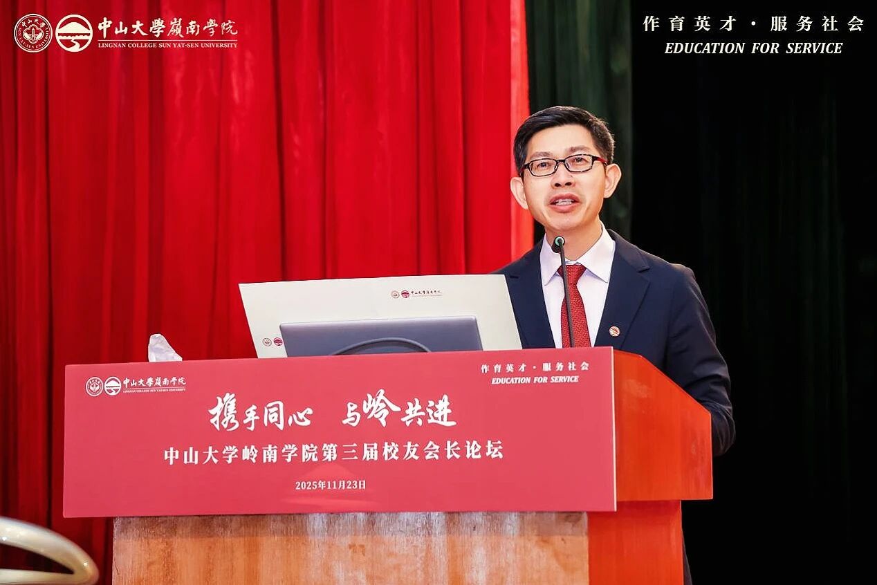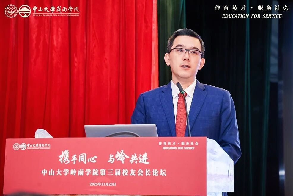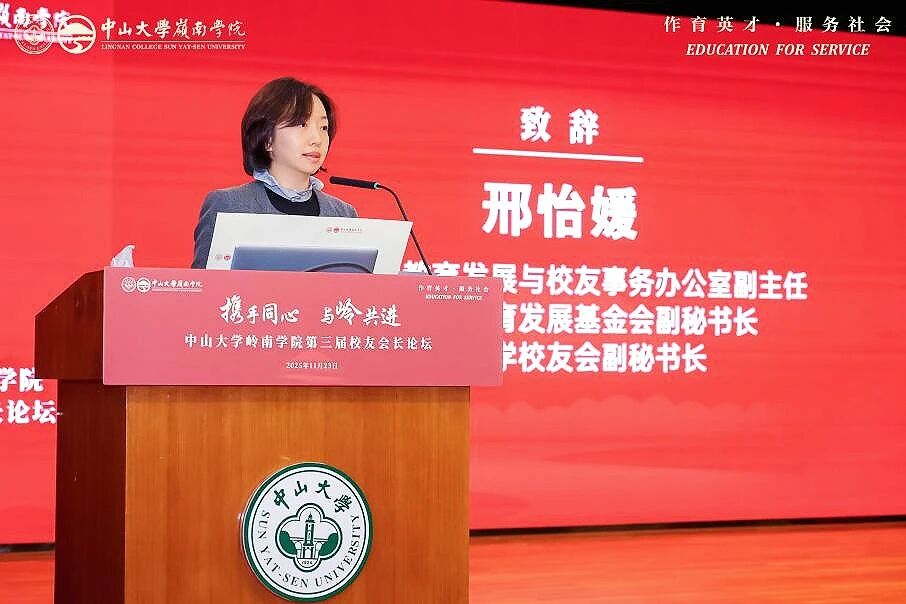 会上,邢怡媛副主任代表学校致辞。她表示,岭南学院作为中山大学人文社科的重要学院,立足粤港澳大湾区,秉承“博学、审问、慎思、明辨、笃行”校训,深耕经济学教育,培养大批具全球视野的领军人才,助力国家发展与大湾区建设,“为社会福、为邦家光”。邢怡媛副主任号召校友携手同行,为教育强国建设及中国式现代化发力。