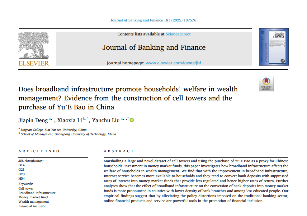 我院邓家品副教授、刘彦初教授与广东工业大学管理学院李晓霞讲师合作的论文Does broadband infrastructure promote households’ welfare in wealth management? Evidence from the construction of cell towers and the purchase of Yu’E Bao in China于2025年12月在金融学领域知名期刊Journal of Banking and Finance正式发表。