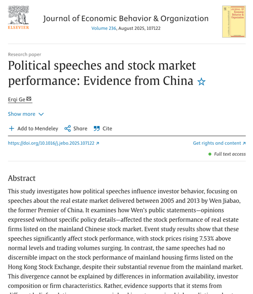 我院葛尔奇助理教授独作论文“Political speeches and stock market performance: Evidence from China”于2025年8月在国际知名期刊《Journal of Economic Behavior & Organization》在线发表。