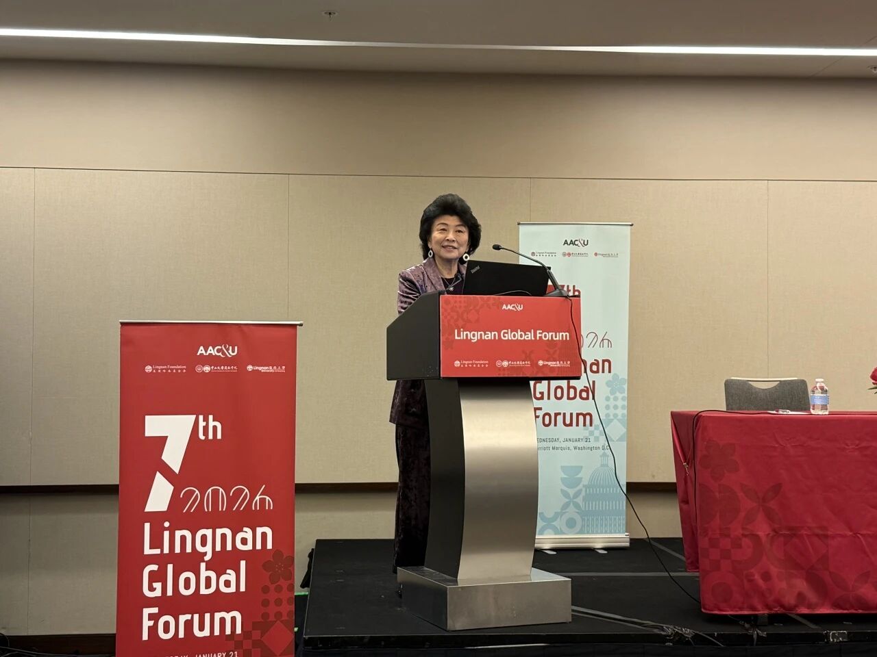 岭南基金会主席Ding-Jo Currie博士回顾了基金会自1893年成立以来支持高等教育、促进中美学术交流的历史传统。她强调,在全球不确定性上升的背景下,跨文化、跨制度的教育对话尤显珍贵,而教育与经济基础的互动,最终取决于人的思想、制度选择与集体行动。