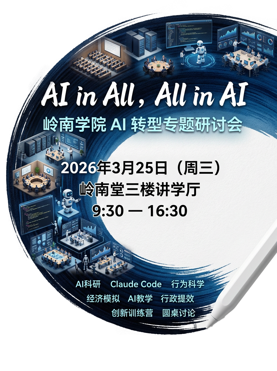 为积极拥抱人工智能发展浪潮,推动学院在科研、教学与行政工作中全面实现AI转型,探索AI与经管学科融合的新路径、新方法,进一步提升科研创新能力、教学实践能力与行政服务效率,岭南学院将于2026年3月25日在岭南堂三楼讲学厅举办“AI in All,All in AI”AI转型专题研讨会。