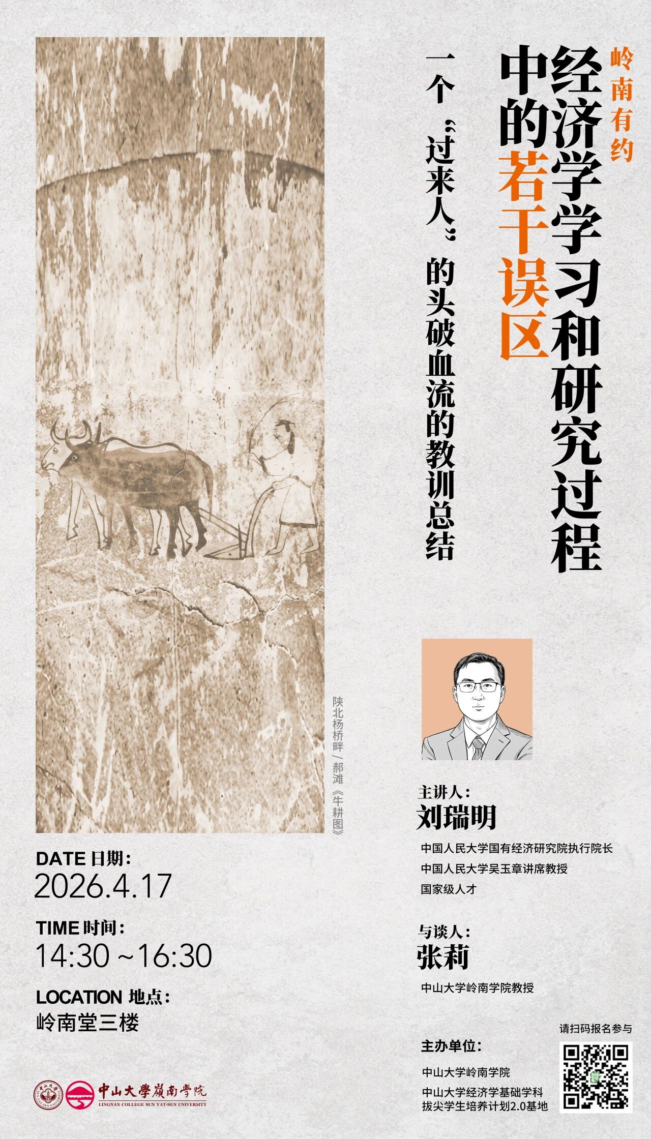 【岭南有约】第一期我们邀请到中国人民大学吴玉章讲席教授刘瑞明老师,与中山大学岭南学院张莉教授展开对谈,和同学们一起聊一聊经济学学习与研究过程中的若干误区。欢迎对此感兴趣的同学报名参与!