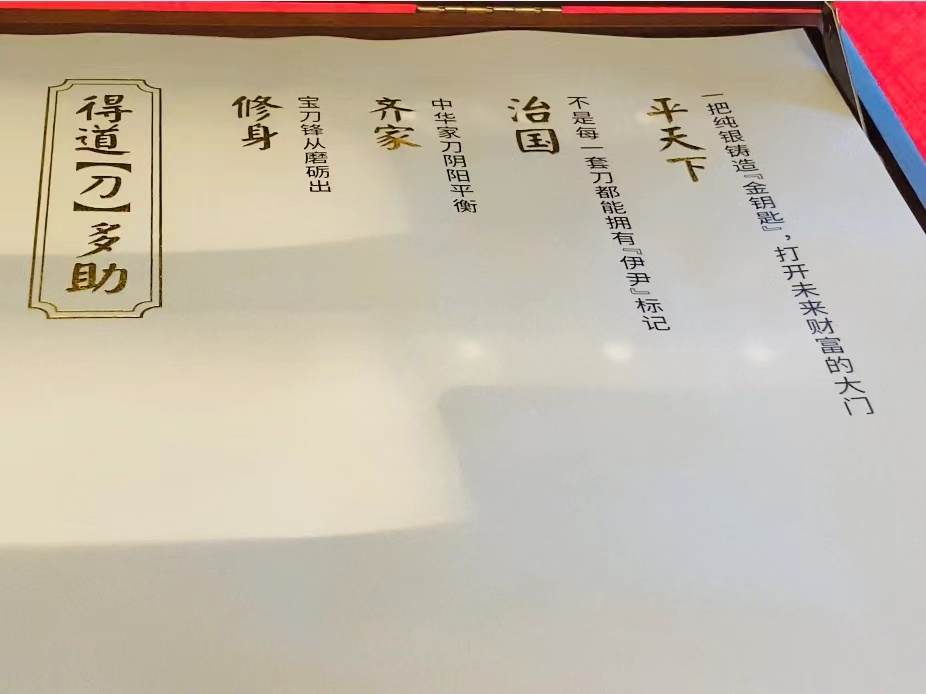 伊尹文武双刀套装,还专配有铝合金铸造乾坤刀座、磨刀装备以及拿铁铁器铸造纯银“一刀平五千”刀币(按汉代原型1:1铸造)。
