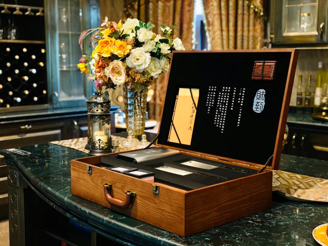 箱盖上,一个精美酸枝木礼品盒盛装一枚“一刀平五千”纯银铸造刀币,寓意“一本万利”。