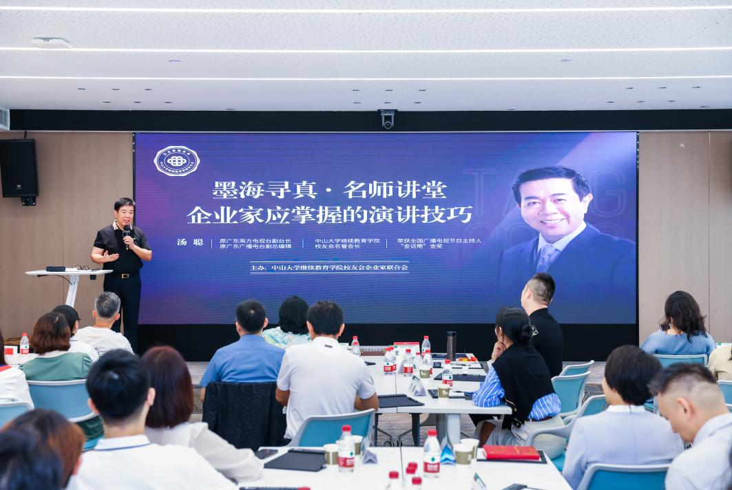 为全方位打造学习型组织,提升企业家联合会理事成员的演讲和表达能力,中山大学继续教育学院校友会企业家联合会组织的“墨海寻真”系列活动之名师讲堂首场活动于8月24日下午成功举办,联合会特别邀请现中国广播电视协会播音主持委员会副会长、原广东南方电视台副台长、广东电视艺术家协会主持人委员会会长、广东广播电视台副总编辑、中山大学继续教育学院校友会名誉会长汤聪老师,为理事们开展了一场关于演讲技巧的《企业家应掌握的演讲技巧》主题演讲。