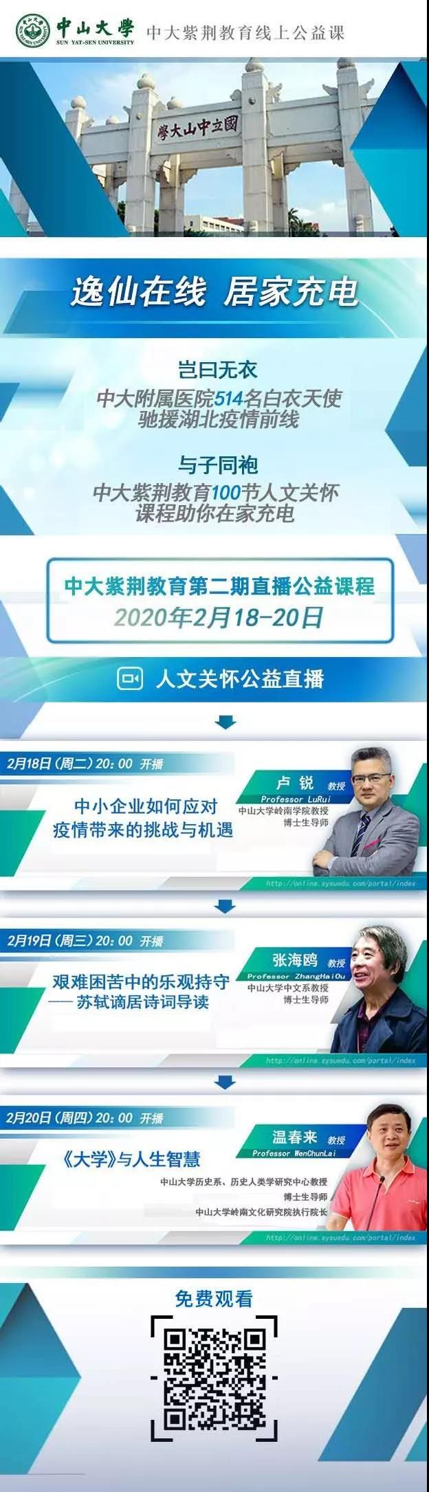 逸仙在线,居家充电!中山大学在线教育第二期直播公益课程重磅开启,诚邀同学们共同学习,敬请关注。
