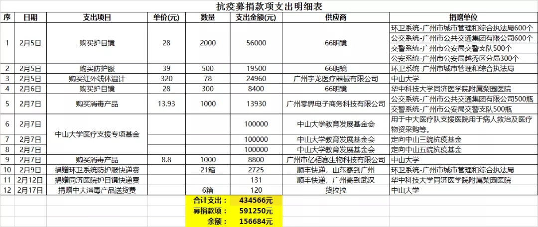 以上共计支出434566元,剩余156684元(详见下面明细支出表)。自发起募捐以来,我们就同步联系各类渠道采购防控物资,也得到很多热心校友的协助,务求做到正规、公开、透明。剩余款项经工作小组商议,将继续采购合适的防控物资捐助相关机构,或继续捐至中山大学医疗支援专项基金。