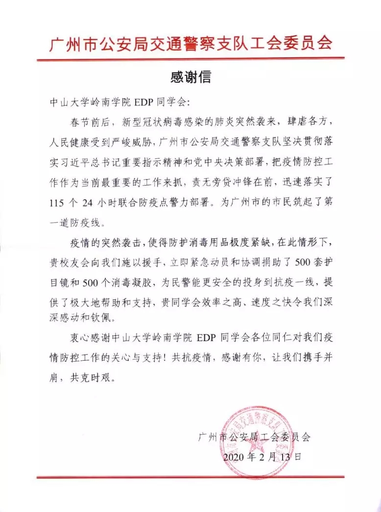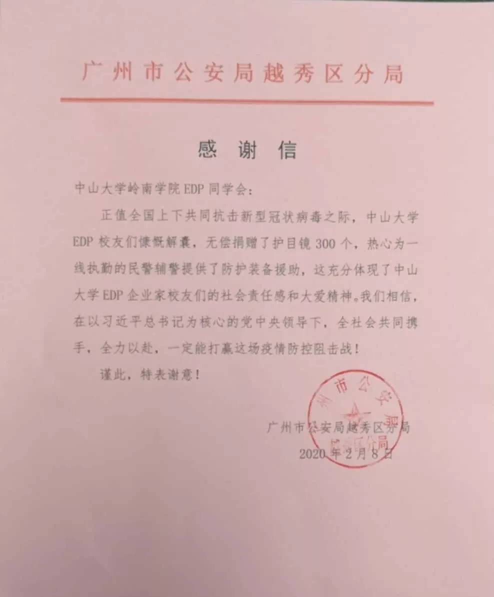 2月初,中山大学岭南学院EDP同学会为广州市公安局越秀分局捐助护目镜300个。捐助的物资用于公安系统工作者抗疫工作期间的防护。