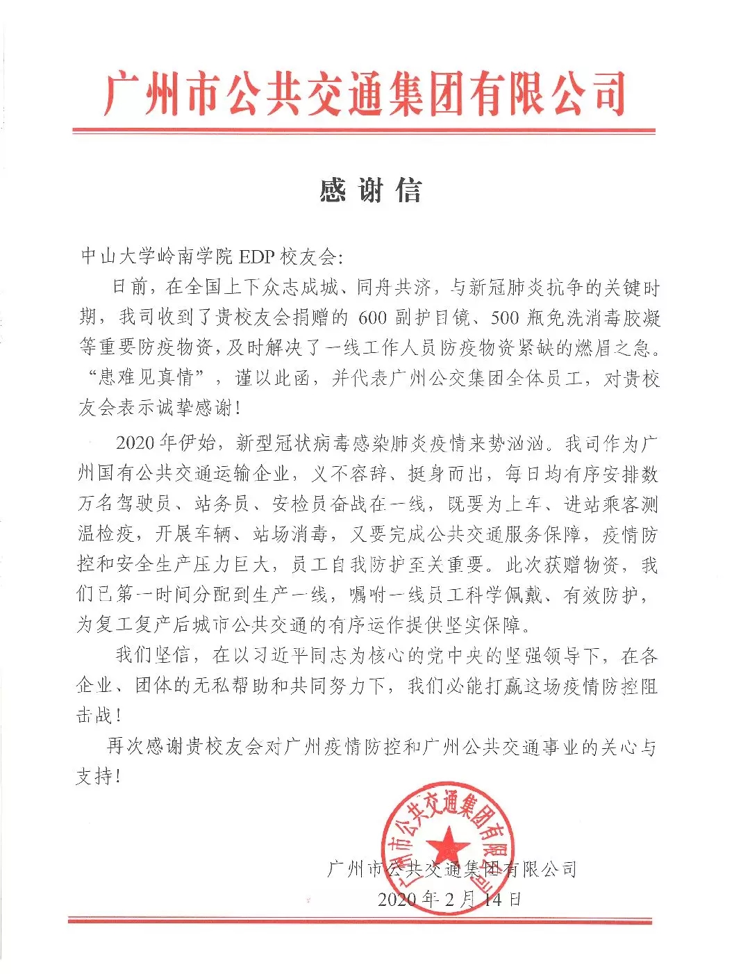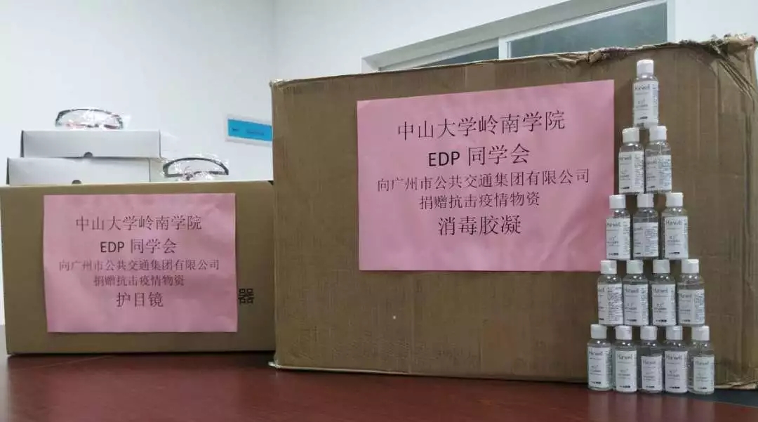 2月初,中山大学岭南学院EDP同学会为广州市公共交通集团有限公司捐助护目镜600个,消毒水500瓶。捐助的物资用于公交系统工作者抗疫工作期间的防护。