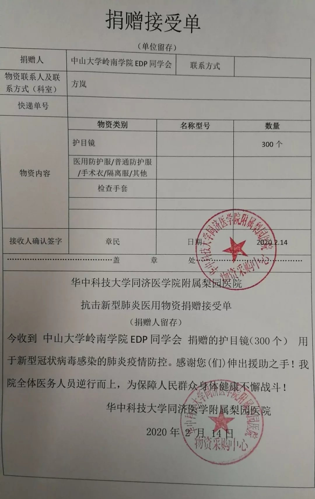 2月初,中山大学岭南学院EDP同学会为华中科技大学同济医院附属梨园医院捐助护目镜300个。捐助的物资用于医护工作者在抗疫工作期间的防护。