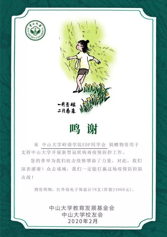 您好!2月1日,中山大学岭南学院EDP同学会向所有校友发出倡议,为抵抗疫情捐资捐物。自募捐倡议发出后,得到了广大校友们的积极响应。