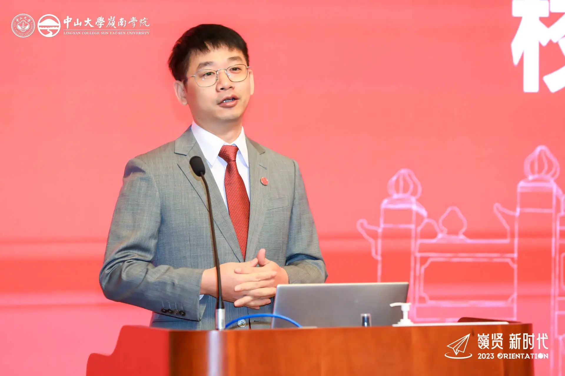 在热烈的掌声中,中山大学岭南学院党委黄毅书记为新生讲授了“思政第一课”,他围绕中山大学的发展、岭南学院的发展、大学精神的传承、对同学们的期望展开分享。他勉励各位学子应“脱俗”、“专业”、“有情怀”。中大学子应有自己独立见解,努力挣脱束缚;夯实专业知识,秉持专业态度,贴近社会、贴近国情,立足中国实际,解决中国实际问题;要铭记创校初衷,始终与国家发展同心同向同步同行,始终不渝地将爱国之情根植于心,将富强国家、复兴民族大任镌刻于行。