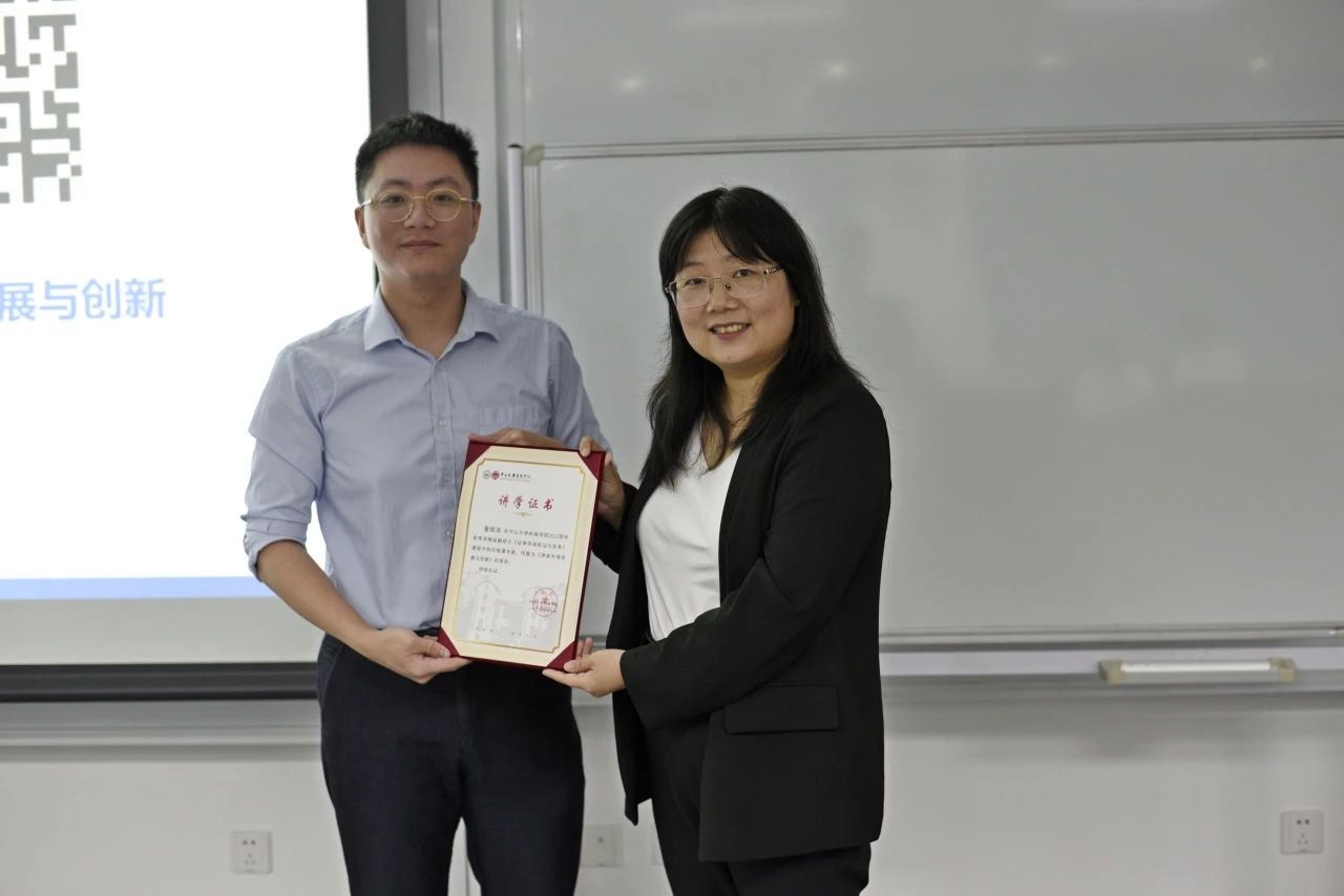 本次课程,除了介绍债券知识外,詹老师还从债券从业者角度为同学们深度分析债券市场的就业岗位及职业路径,拓宽了同学们未来的职业规划方向。在热烈的讨论气氛中,本次《证券市场前沿与实务》系列讲座圆满结束。课后,金融学系主任戴芸副教授代表学院为詹老师颁发了讲学证书。
