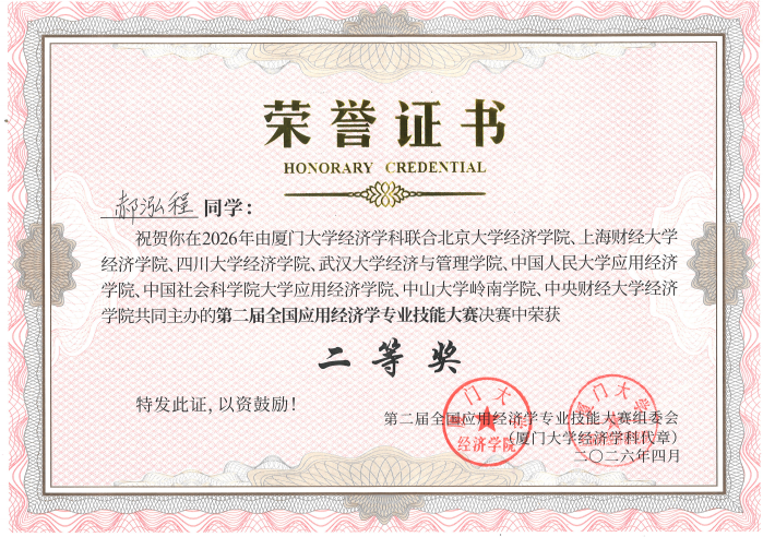近日,第二届全国应用经济学专业技能大赛总决赛落幕,中山大学岭南学院传来喜讯,在激烈的竞争中,23级本科生郝泓程同学脱颖而出,荣获二等奖,学院荣获优秀组织奖。